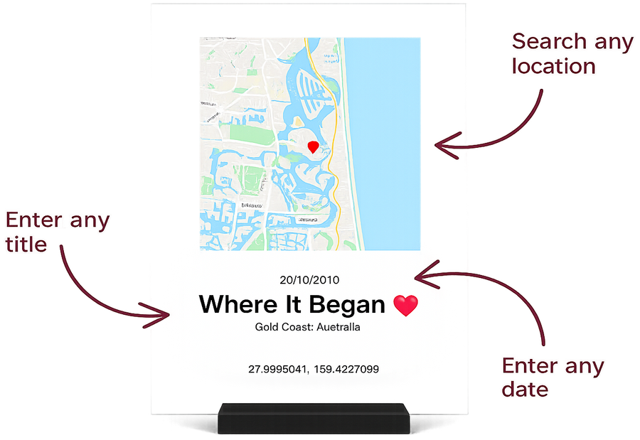 Pinpoint the memories that matter. Customize a map plaque with your special place and date, turning geography into a story.