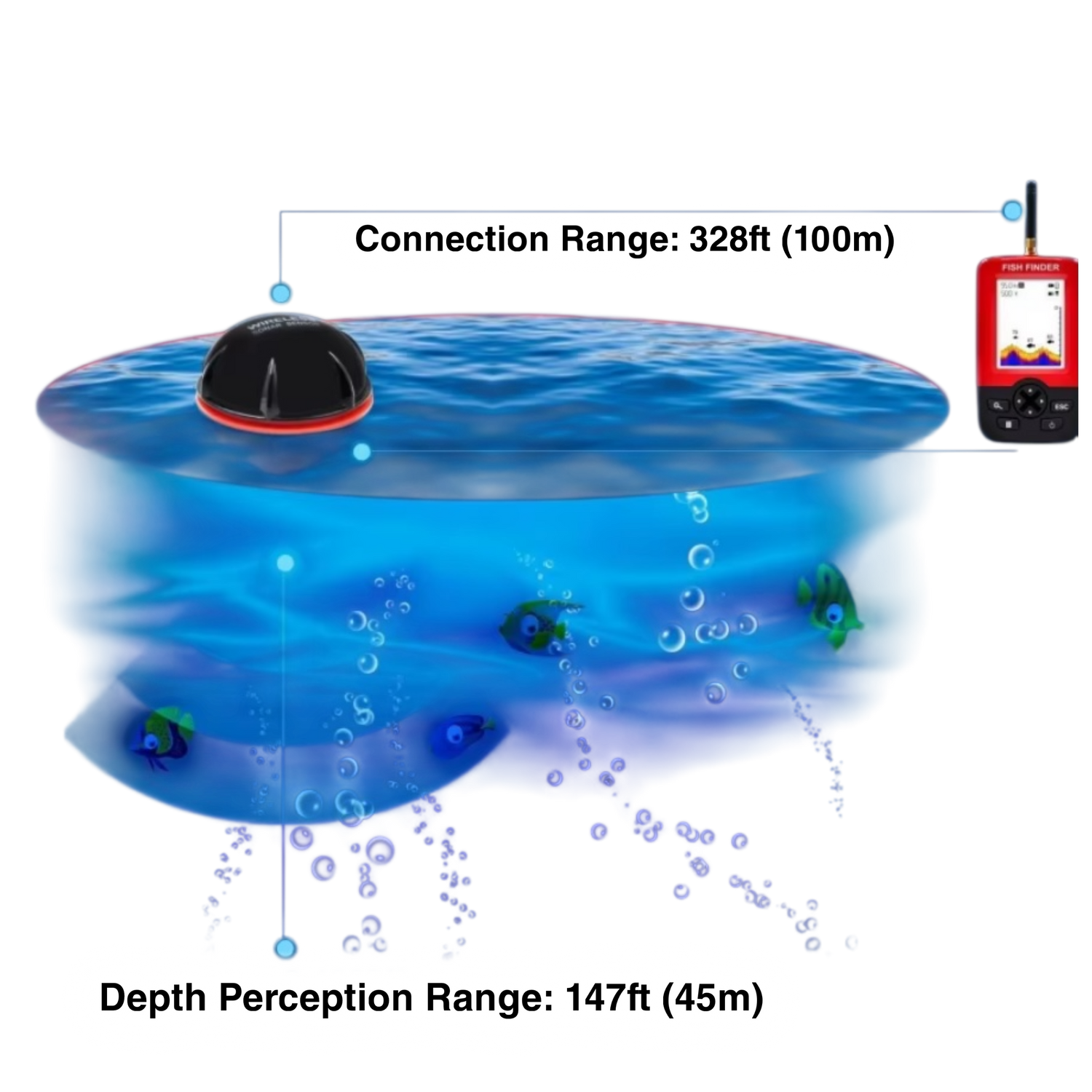 Up to 45 m (147 ft) in clear water with full sonar sensitivity.
